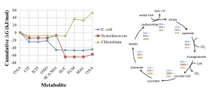 We have applied a new stochastic simulation approach to predict the metabolite levels, material flux and thermodynamic profiles of the oxidative TCA cycles found in E. coli and Synechococcus sp. PCC 7002, and in the reductive TCA cycle typical of chemolithoautotrophs and phototrophic green sulfur bacteria such as Chlorobaculum tepidum. The simulation approach is based on modeling states using statistical thermodynamics and employs an assumption similar to that used in transition state theory. The ability to evaluate the thermodynamics of metabolic pathways allows one to understand the relationship between coupling of energy and material gradients in the environment and the self-organization of stable biological systems, and it is shown that each cycle operates in the direction expected due to its environmental niche. The simulations predict changes in metabolite levels and flux in response to changes in cofactor concentrations that would be hard to predict without an elaborate model based on the law of mass action. In fact, we show that a thermodynamically unfavorable reaction can still have flux in the forward direction when it is part of a reaction network. The ability to predict metabolite levels, energy flow and material flux should be significant for understanding the dynamics of natural systems and for understanding principles for engineering organisms for production of specialty chemicals.
